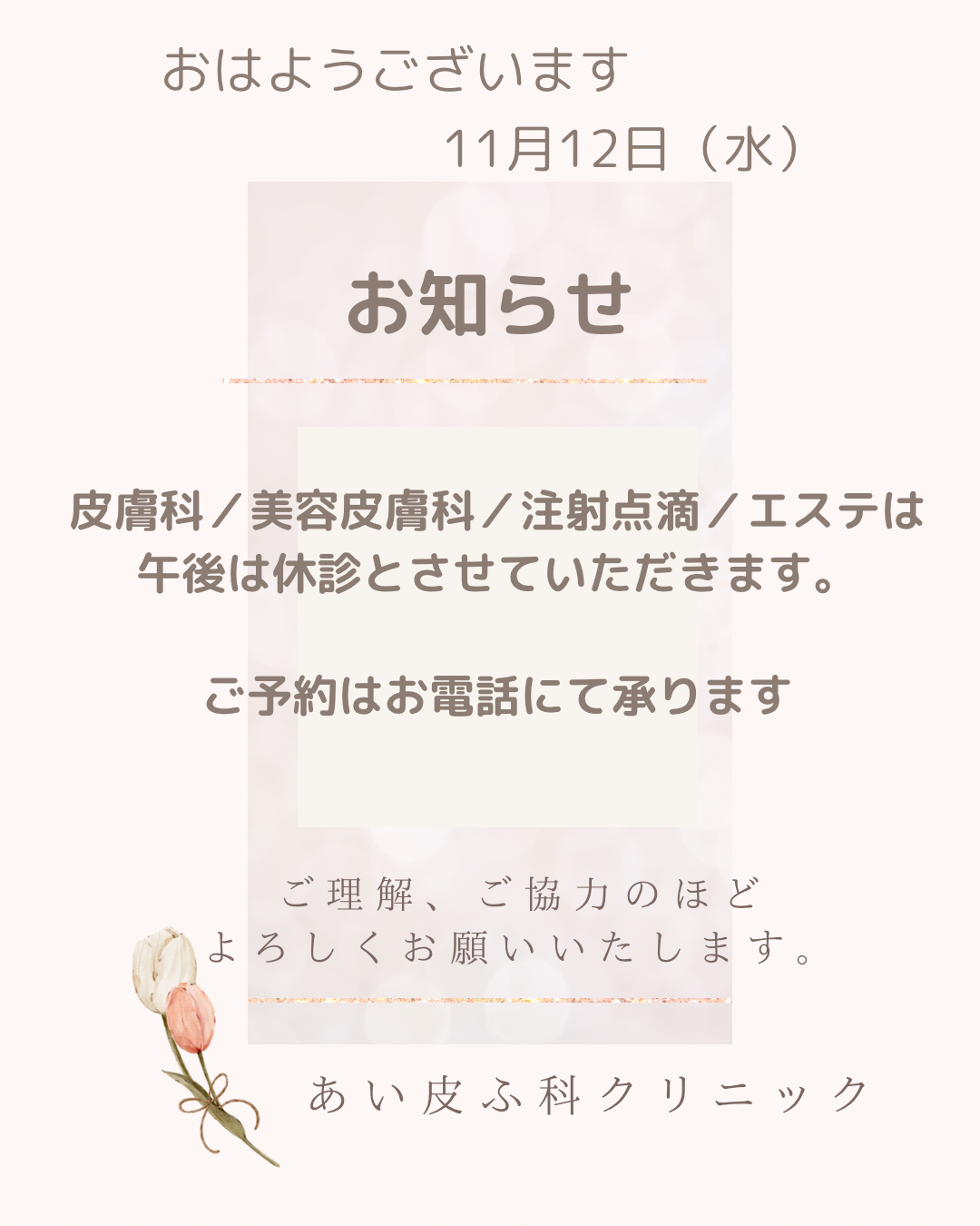 11月12日午後からの休診のお知らせです。